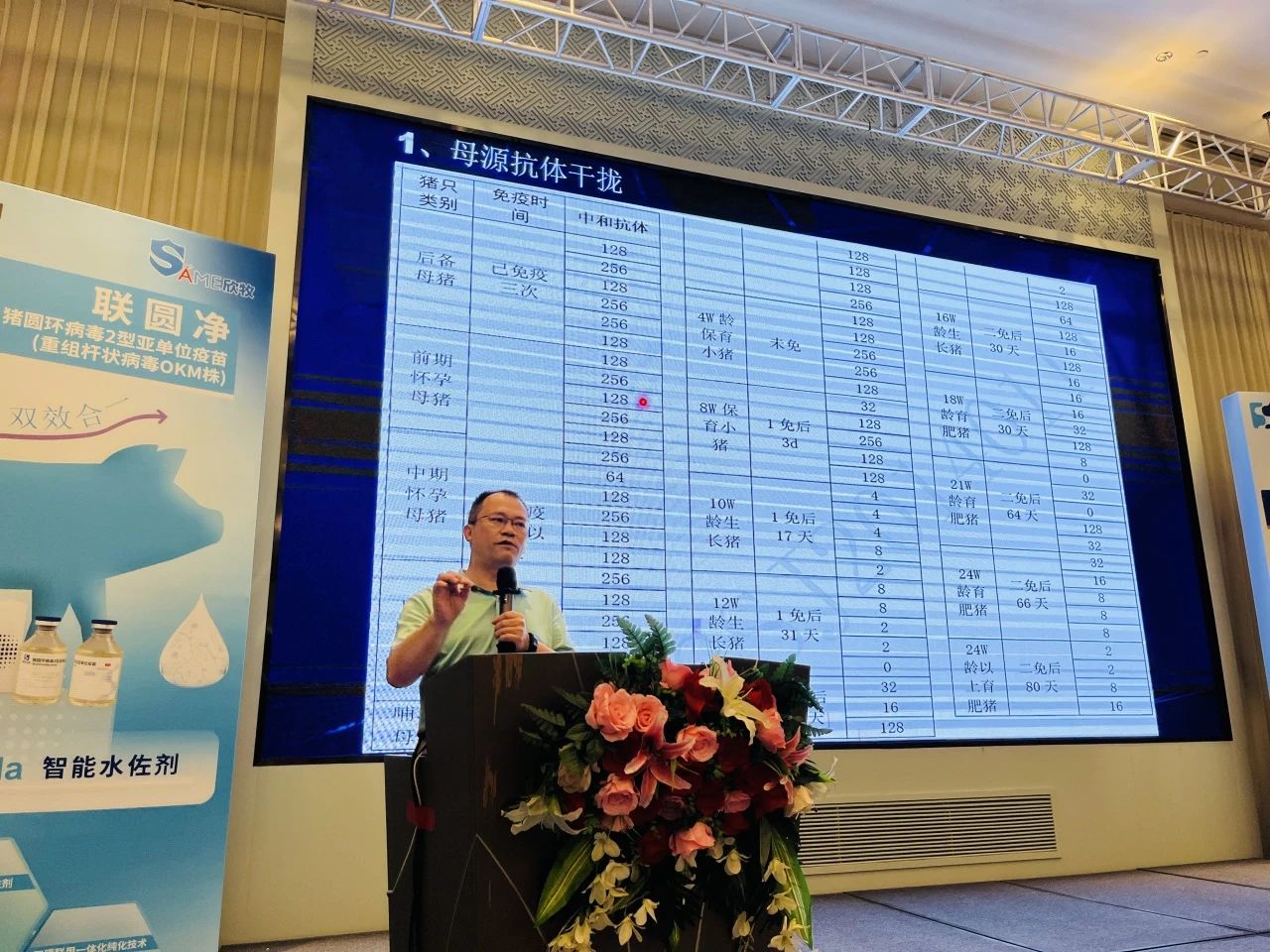 技术服务总监王江辉作了《联圆净的应用和案例分析》的报告,围绕圆环疫苗交叉保护力、免疫程序、免疫效果评估等问题展开介绍,并对“联圆净”产品在猪场使用的一些临床数据给大家做了分享和交流。