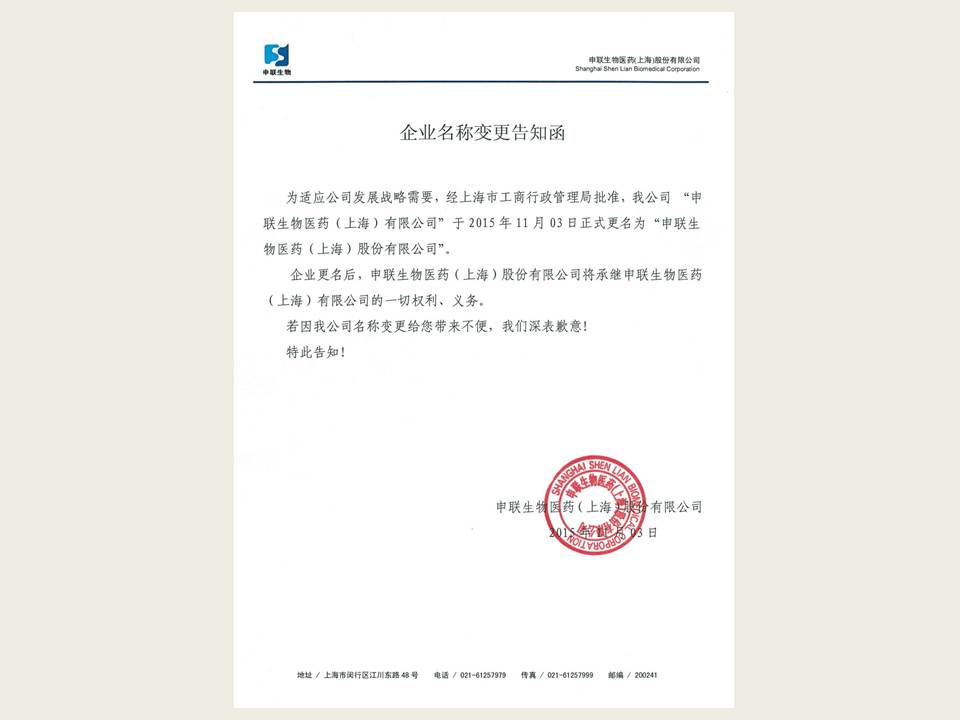 2015年11月03日,为适应公司发展战略需要,“凯发k8一触即发生物医药(上海)有限公司”正式更名为“k8凯发[中国]天生赢家·一触即发 ”。企业更名后,k8凯发[中国]天生赢家·一触即发 将继承凯发k8一触即发生物医药(上海)有限公司的一切权利、义务。